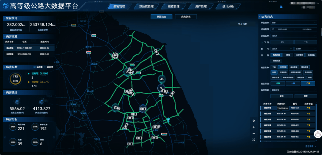 盐城初创“采办放哨数据办事”模式,聚焦公管养智能化成长,核心可对病害数据进行及时查看。可及时采集面表不雅病害(如坑槽、裂痕)、交通平安设备非常(护栏缺失、标线损坏)及抛洒物等现患。该系统可识别六大类28项病害,